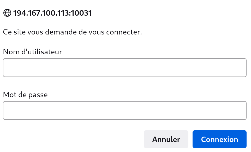Bonsoir, Je ne comprends pas trop le "je n'ai plus rien". Pour moi tout est nickel ! Et quand j'essaye d'accéder à votre e-comBox (http://194.167.100.113:10031/), j'ai bien accès à l'authentification (voir fichier joint). Est-ce que vous pouvez m'expliquer un peu plus ce qu'il se passe. Cordialement, |