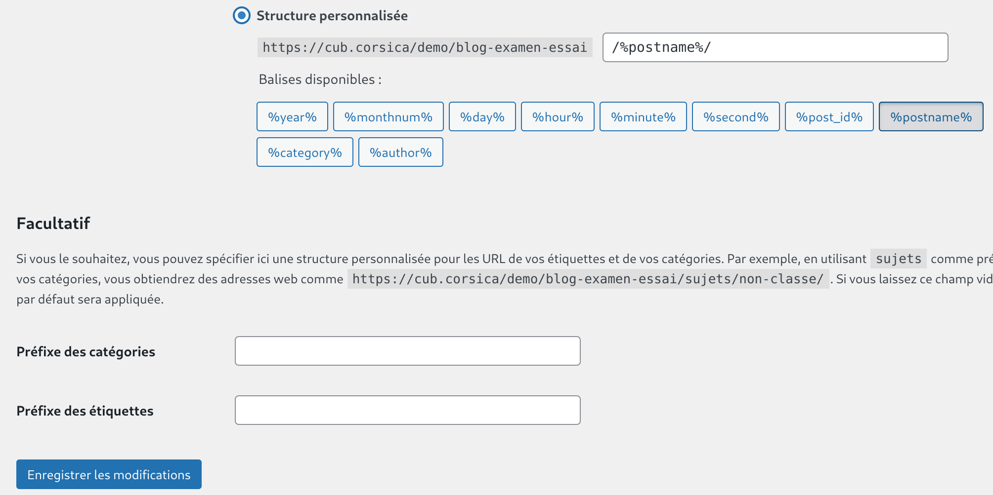 Re bonjour, J'ai résolu le problème (à priori) en changeant la structure des permaliens. Dans "Réglage des permaliens", j'ai coché "Structure personnalisée" puis j'ai enregistré (voir image jointe). Et les sous-menus sont de nouveau accessibles sans erreur 500. Quand on enregistre, ça revient ensuite sur "Titre de la publication", je ne sais trop pourquoi mais ça a l'air de faire le travail quand même. Pour ne pas avoir à modifier chaque site issu d'un modèle, il faut, je pense, faire cette manipulation avant de re-créer le modèle. N'hésitez pas à revenir vers nous pour nous dire si cette manipulation fonctionne bien. Sinon, il faudra qu'on creuse un peu plus. Cordialement, |