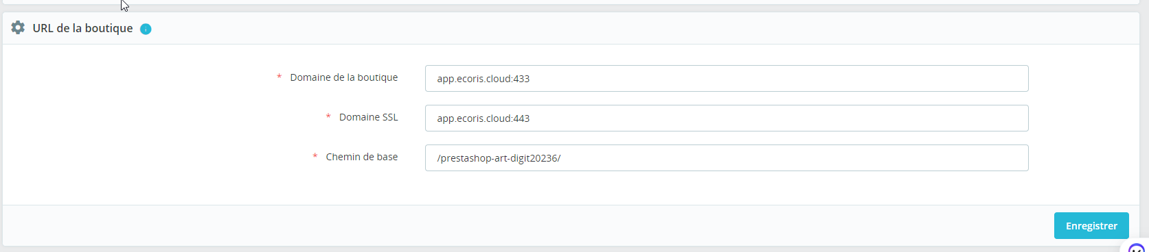 | Steps To Reproduce | Mise en place d'une instance d'Ecombox avec un nom de domaine public tel que app.domain.com. Configuration d'un site PrestaShop à l'adresse app.domain.com/prestashop-art-digit20236/. Connexion au backoffice, puis navigation vers l'URL du front (les images ou le front ne sont pas accessibles). Modifier l'URL de la boutique dans les paramètres "Traffic et SEO", appliquer la configuration et le problème disparaîtra. | ||||