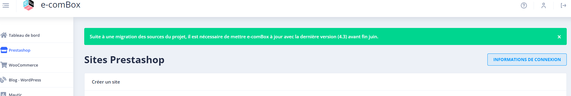| Description | Bonjour à tous, Un des utilisateurs de la plateforme E-comBox de notre établissement scolaire vient de nous faire remonter l'information suivante : Quand on est connecté sur la plateforme et que l'on se trouve sur un des onglets des différents sites (Prestashop, Woocommerce, Blog - WordPress...), un bandeau indique le message suivant : "Suite à une migration des sources du projet, il est nécessaire de mettre E-comBox à jour avec la dernière version (4.3) avant fin juin." (voir capture d'écran pour plus de détails) Quel est l'impact réel si nous nous ne mettons pas à jour E-Combox dans le temps imparti ? | ||||