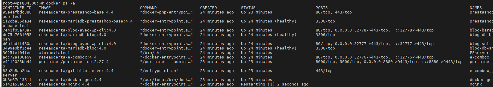 root@vps804308:~# docker ps -a CONTAINER ID IMAGE COMMAND CREATED STATUS PORTS NAMES c9652ef8d9f7 reseaucerta/prestashop-base:4.4 "docker-php-entrypoi…" 7 minutes ago Up 7 minutes 80/tcp, 443/tcp prestashop-base-test 7e050384c4f7 reseaucerta/mariadb-prestashop-base:4.4 "docker-entrypoint.s…" 7 minutes ago Up 7 minutes (healthy) 3306/tcp prestashop-db-base-test 1e300d3630c9 reseaucerta/blog-avec-wp-cli:4.0 "docker-entrypoint.s…" 7 minutes ago Up 7 minutes 80/tcp, 0.0.0.0:32781->443/tcp, :::32781->443/tcp blog-baraban cd8b9be4093a reseaucerta/mariadb-blog:4.0 "docker-entrypoint.s…" 7 minutes ago Up 7 minutes (healthy) 3306/tcp blog-db-baraban c62721df97f5 reseaucerta/blog-avec-wp-cli:4.0 "docker-entrypoint.s…" 8 minutes ago Up 7 minutes 80/tcp, 0.0.0.0:32780->443/tcp, :::32780->443/tcp blog-snt c45081498672 reseaucerta/mariadb-blog:4.0 "docker-entrypoint.s…" 8 minutes ago Up 7 minutes (healthy) 3306/tcp blog-db-snt 2a3bc6c7ec04 alpine:latest "/bin/sh" 8 minutes ago Up 8 minutes FSserver 8b8416548f76 reseaucerta/e-combox:4.4 "/docker-entrypoint.…" 8 minutes ago Up 8 minutes 80/tcp, 0.0.0.0:32779->443/tcp, :::32779->443/tcp e-combox f2400b10a8aa portainer/portainer-ce:2.27.4 "/portainer --admin-…" 8 minutes ago Up 8 minutes 8000/tcp, 9000/tcp, 0.0.0.0:8880->9443/tcp, :::8880->9443/tcp portainer-app 20c5ed26f870 reseaucerta/git-http-server:4.4 "/entrypoint.sh" 8 minutes ago Up 8 minutes 443/tcp e-combox_gitserver b7ecdc16cbba reseaucerta/registry:4.4 "/entrypoint.sh /etc…" 9 minutes ago Up 8 minutes 5000/tcp, 0.0.0.0:5443->443/tcp, :::5443->443/tcp e-combox_registry 6986a0589a63 reseaucerta/docker-gen:4.4 "/usr/local/bin/dock…" 9 minutes ago Up 9 minutes docker-gen f8a670c4989c reseaucerta/nginx:4.4 "/docker-entrypoint.…" 9 minutes ago Restarting (1) 20 seconds ago nginx root@vps804308:~# |